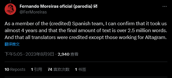 游戏的西班牙语本地化团队的一名员工表示,他们在《博德之门3》上花费了“近 4 年的时间,最终文本量超过 250 万字。”