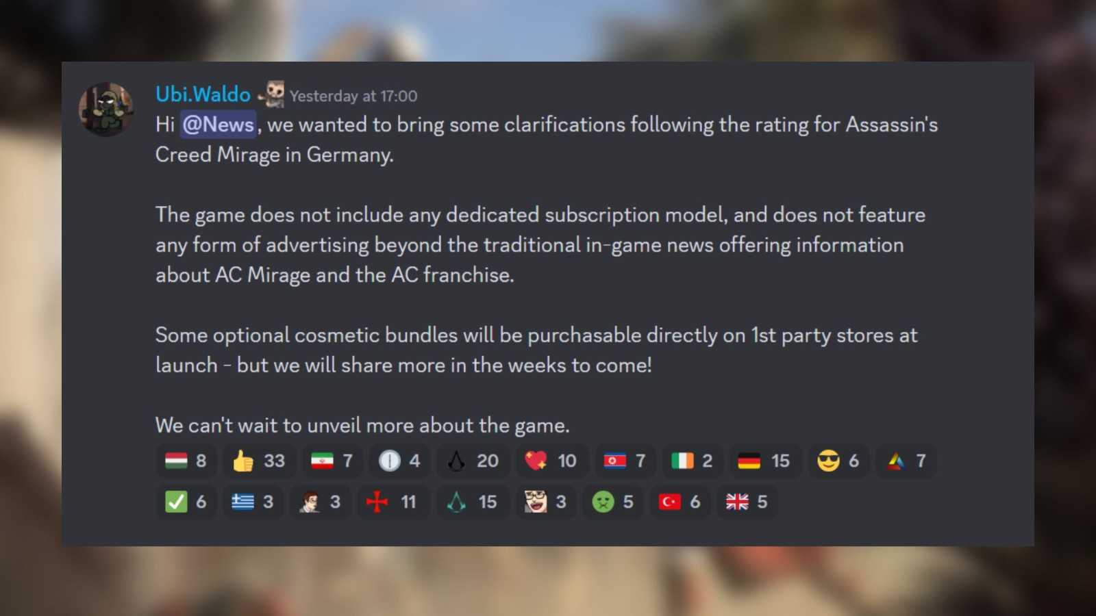 育碧发言人称:“《刺客信条:幻景》不包含任何专门的订阅模式,也没有任何形式的广告。不过有传统的游戏内新闻,能提供有关《幻景》和刺客系列的信息。游戏发售后,玩家将能在第一方商店里购买一些皮肤,我们将在未来几周内分享更多内容!”