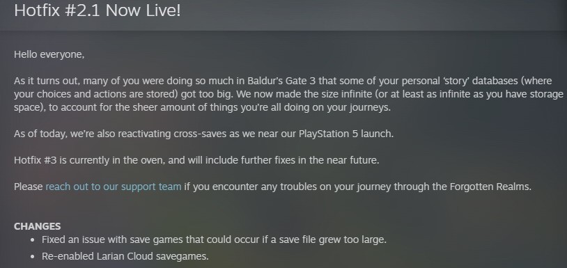 《博德之门3》2.1版本热补丁现在已经上线了,拉瑞安官方在本次更新之后表示 ,由于很多玩家在本作中做的事情太大了,导致了部分玩家的个人存档数据库太大出现存档问题,现已将游戏的存档数据库改成了无限大,上限至玩家的存储空间,以满足玩家在游戏中的大量游玩内容。
