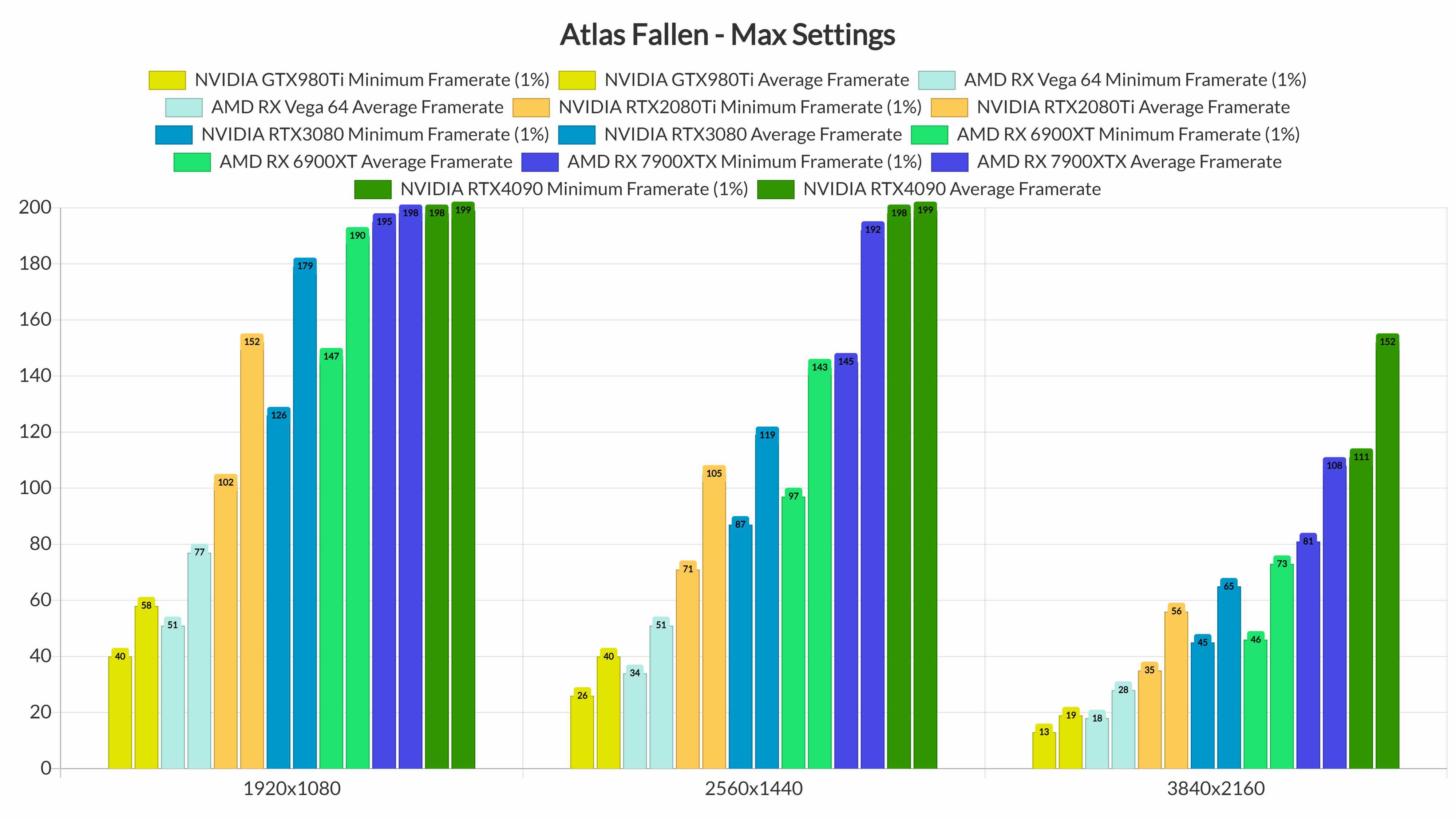 在1440p/最高画质下,我们的NVIDIA RTX2080Ti、RTX3080、RTX4090、AMD RX 6900XT和RX 7900XTX可毫无问题地运行游戏。至于原生4K/最高画质,唯一能够稳定超过60fps帧率的显卡是NVIDIA RTX4090和AMD Radeon RX 7900XTX。