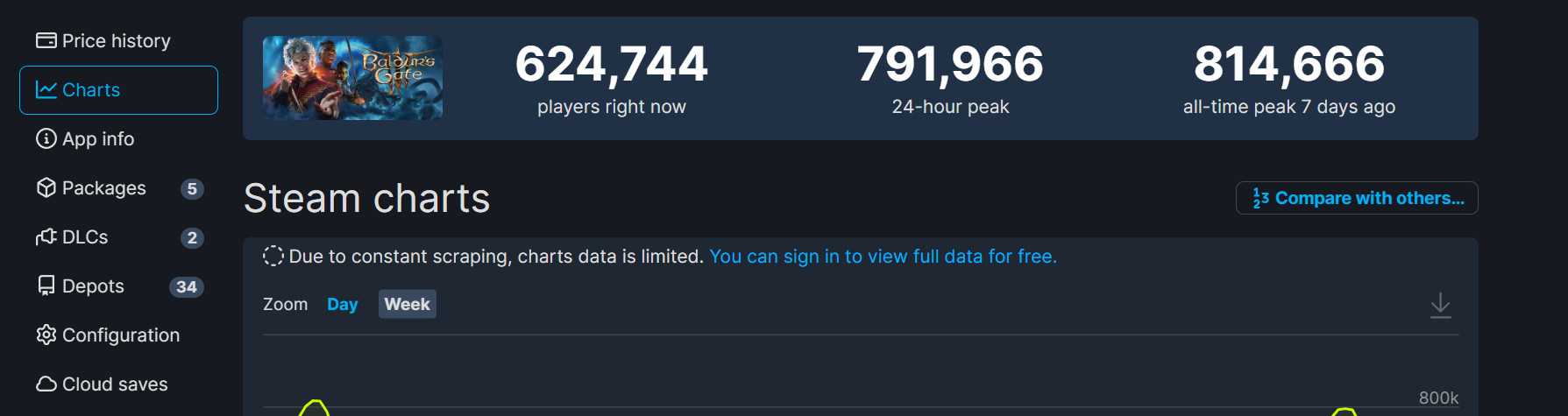 然而在指定日期时,《博德之门3》24小时峰值为79.1万,当前在线62.4万。显然这一粉丝向活动并没有起到作用。
