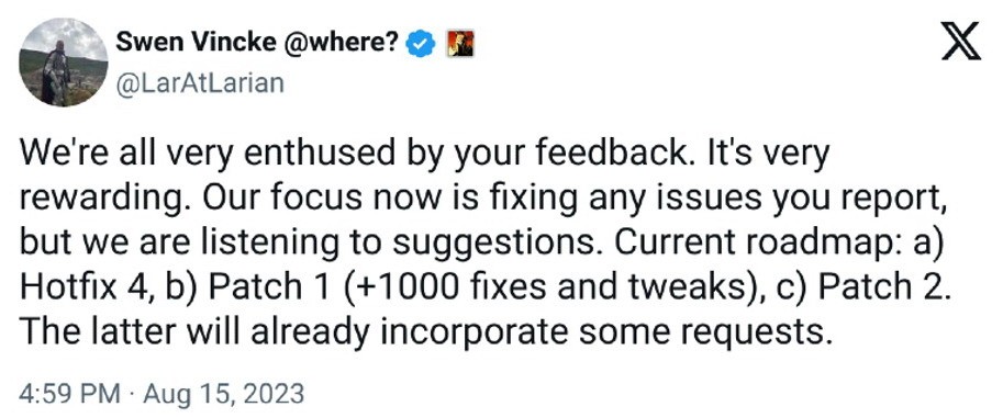 Vincke表示:“我们对你的反馈很感兴趣,这是非常值得的。现在的重点是解决玩家报告的任何问题,但也会听取建议”。这也意味着修复Bug和调整游戏是拉瑞安首要任务,但额外功能也在开发中。