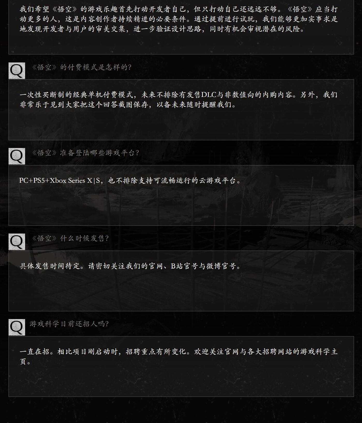 《黑神话:悟空》近日在官方网站开设了一个“常见问题”类目,针对一些玩家比较关心的问题进行了解答,根据官方的介绍来看,游戏将会登陆PC、PS5和Xbox Series X|S平台,且不排除登陆云游戏平台的可能。
