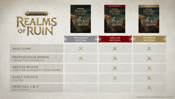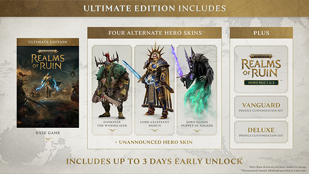 寻求完整体验的《战锤西格玛时代:毁灭国度》粉丝可以预定终极版。除了游戏本体外,还可以访问 4 个额外英雄皮肤(每个派系一个)、2 个个人资料定义集以及英雄 DLC 1 和 2(将在发布后推出),并添加 2 个可在多人游戏和征服模式中使用的英雄。