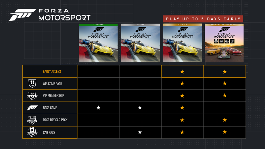 8月23日起,PC玩家可以在Steam上预购《极限竞速》(Forza Motorsport)。预购了Premium Edition的玩家可以在2023年10月6日,于正式发布时间前五天抢先玩到游戏。游戏支持跨平台在线匹配和跨平台保存进度,并且首次支持跨Xbox Series X|S和Steam平台,车手们可以与PC和主机上的朋友一起游玩,并共享进度和成就解锁: