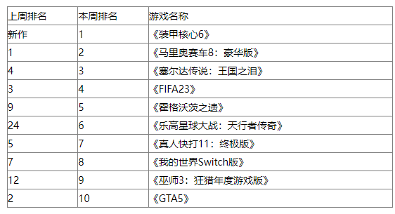 英国实体销量周榜:《装甲核心6》无悬念榜首(英国实体销量周榜:《霍格沃茨之遗》连续两周登顶)