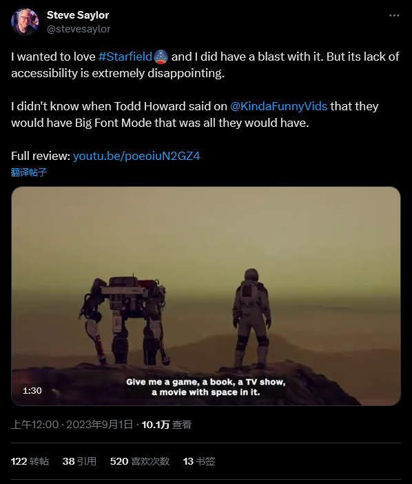 该分析来自 Steve Saylor 的无障碍评测。他是一位盲人游戏玩家,曾为各种游戏的无障碍选项提供了建议。他批评了《星空》的残障玩家辅助选项非常有限。在推特(X)上他说道:“我很想要去喜欢《星空》,而且我确实很喜欢它。但它缺乏可访问性非常让人失望。托德·霍华德在 @KindaFunnyVids 上说他们会有大规模字体模式的时候,我还不知道这就是他们所拥有的全部了。”