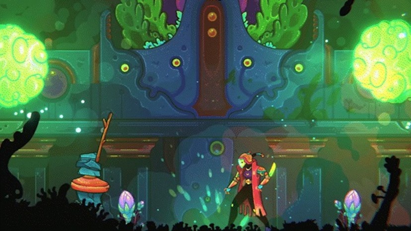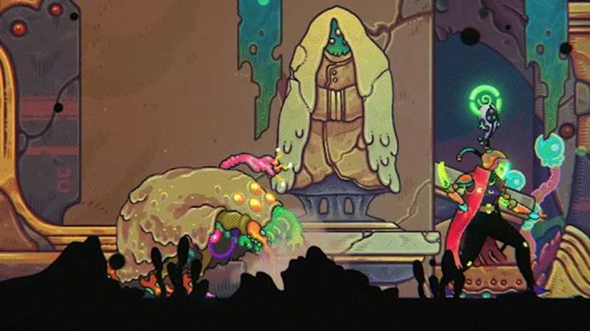 《Ultros》是一场五光十色的科幻冒险。Ouji——衣着华丽的旅行者,灵活敏捷地奔跑、翻滚、跳跃。倾颓的古老花园里,诡异的雕像默默投来目光,断壁残垣里生长着奇艳的花草。交织缠绕的藤蔓背后的幽暗处,有轻轻的呢喃。藻绿的泥潭更深处,隐藏着巨大的绿翅虫振翅时危险的嗡鸣。