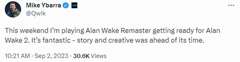 Mike Ybarra表示:“这个周末我正在玩《心灵杀手:重制版》,为《心灵杀手2》做准备。这款游戏太棒了——其故事和创意都走在时代的前沿。”