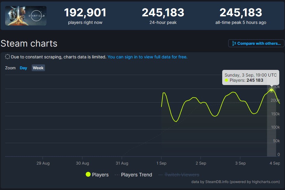 9月1日,《星空》玩家在线人数峰值已达234502人,该记录在昨晚7点被刷新至245183人,截至发稿时在线人数为192901人。《星空》于9月6日正式发布后,玩家在线人数峰值或将继续上升。