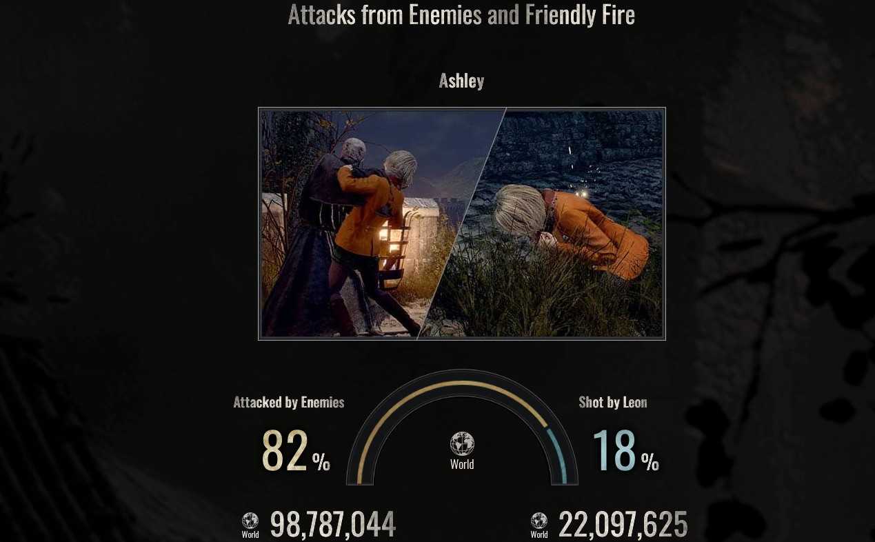 《生化危机4:重制版》有19,690,831名玩家前去营救阿什莉,最终阿什莉获救7,409,784次。阿什莉被敌人攻击总次数约为9878万次,占比82%,而被里昂攻击的次数约为2210万次,占比18%。