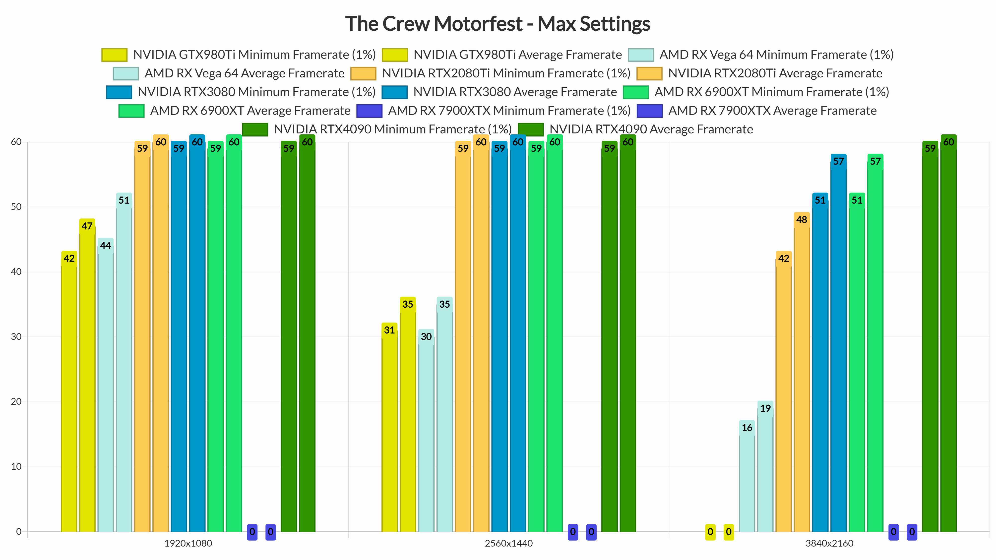 在1440p/最高设置下,我们前四名的显卡都毫无问题地以60fps运行游戏。至于原生4K/最高设置,唯一能够提供60fps体验的显卡是NVIDIA RTX 4090。此外,我们的NVIDIA GTX980Ti在基准测试中崩溃了(可能是由于显存问题)。