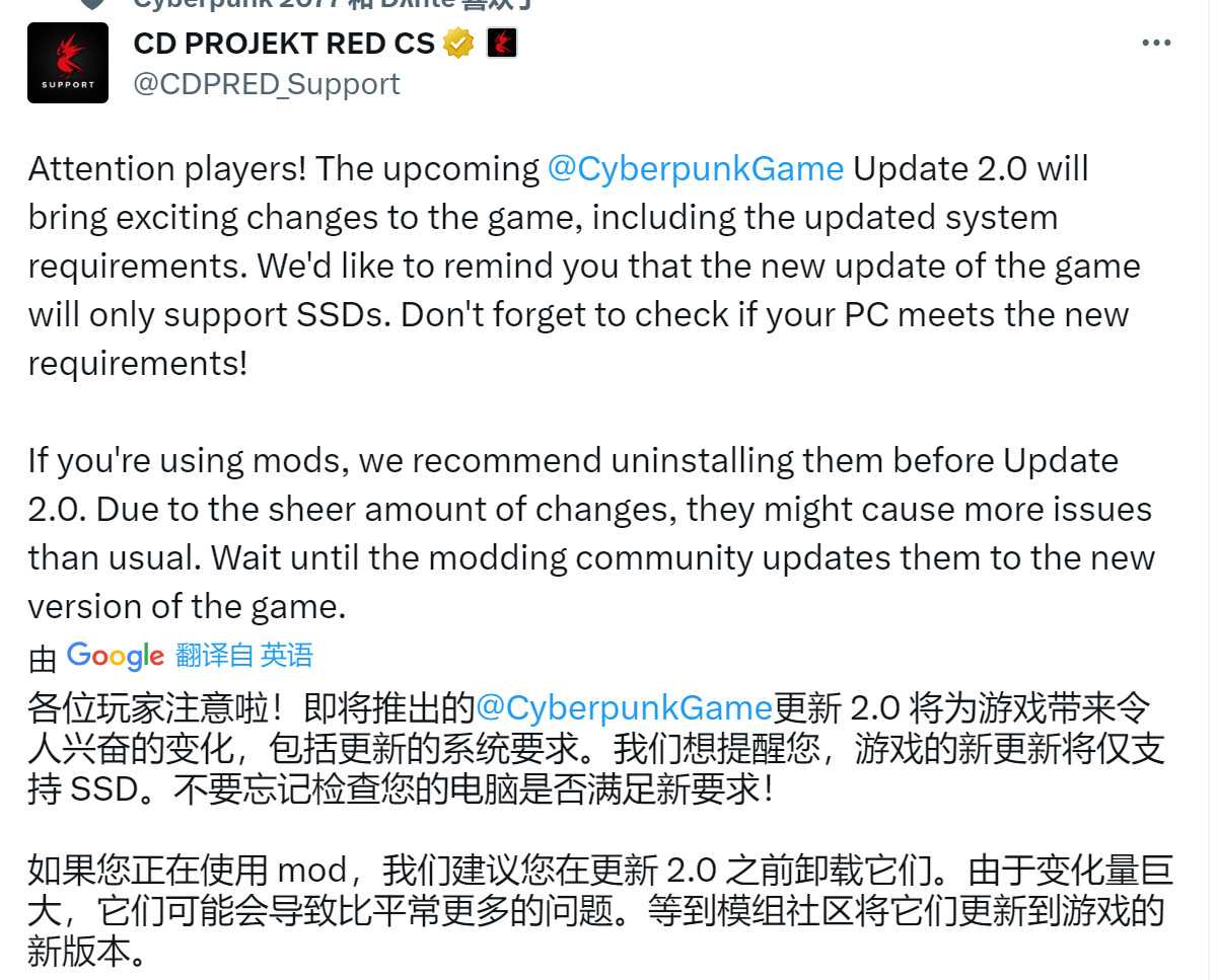 《赛博朋克2077》的客服近日在官方推特上提醒玩家,游戏新上线的2.0更新后会给玩家带来大量的改动内容,同时包含了游戏的系统配置更新,在这里客服还提醒玩家2.0更新之后只支持SSD固态硬盘。