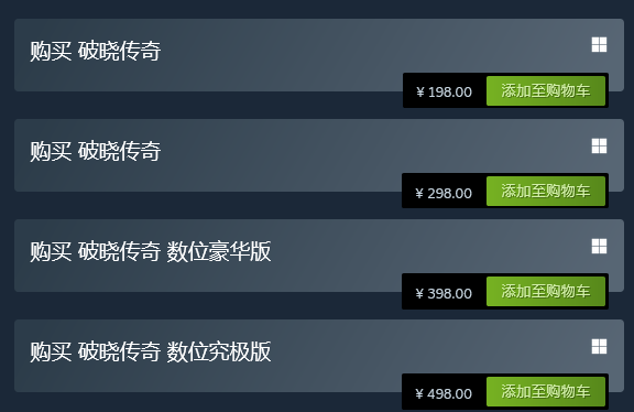 《破晓传奇》在今日开放了游戏的全新DLC“黎明新程”的预购,同时游戏的本体在Steam国区进行了售价永降,原价328现在只需要198即可入手,目前游戏有本体198元、黎明新程版298元、黎明新程数字豪华版398元以及黎明新程数字究极版498元四个版本可以购买,游戏的新DLC“黎明新程”单独售价178元。