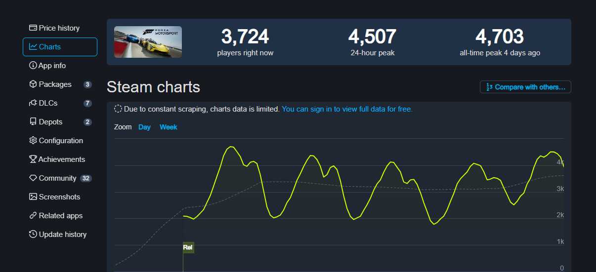 根据SteamDB,《极限竞速:Motorsport》四天前发售,但首发同时在线峰值只有区区4703人,当前在线只有3724人。即便是《红霞岛》Steam在线峰值也超过了6万。