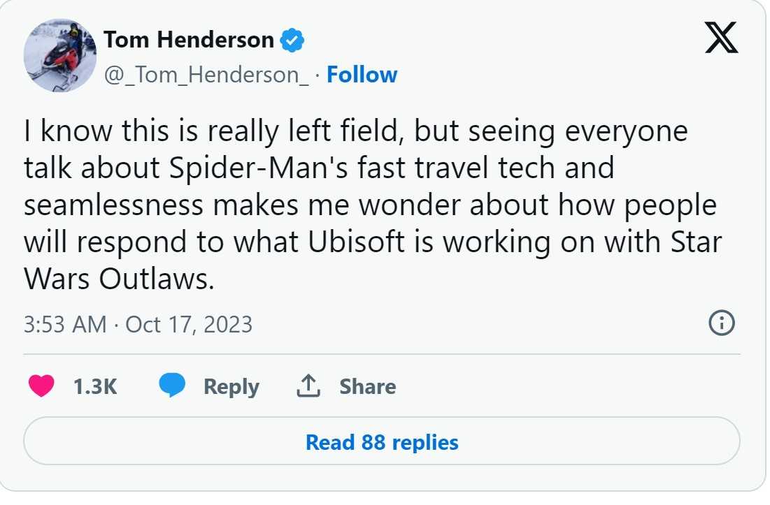 “我知道说这个有点不太合适,但看到大家都在谈论《漫威蜘蛛侠2》的快速穿越和无缝技术,我真的想知道人们将如何回应育碧在《星球大战:法外之徒》这个游戏上正在做的事情。”