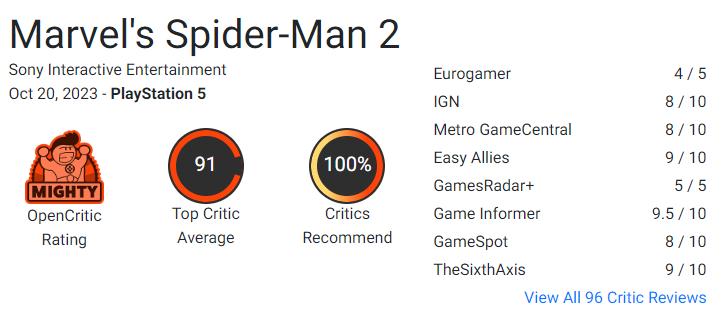 另外,在OpenCritic上《漫威蜘蛛侠2》的均分也达到了91,评论总数达96条。