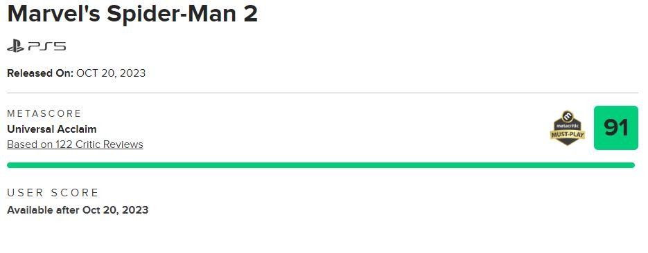 截止到当前,《漫威蜘蛛侠2》在Metacritic均分91,共受到122家媒体的评论,成为Metacritic上评分最高的Insomniac Games游戏,与2004年的《瑞奇与叮当3》持平。这意味着《漫威蜘蛛侠2》也成为了Insomniac Games近20年以来第一款在Metacritic获得90分以上评价的游戏。