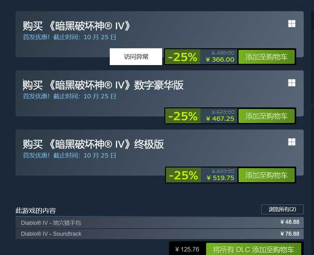 《暗黑破坏神4》现已在Steam平台上线,这也是暴雪第二款上线了Steam平台的作品,第一款是《守望先锋》。目前游戏的标准版、豪华版和终极版都处于-25%优惠中,标准版原价488元,现在只需366元,本次优惠时间截止到10月25日。