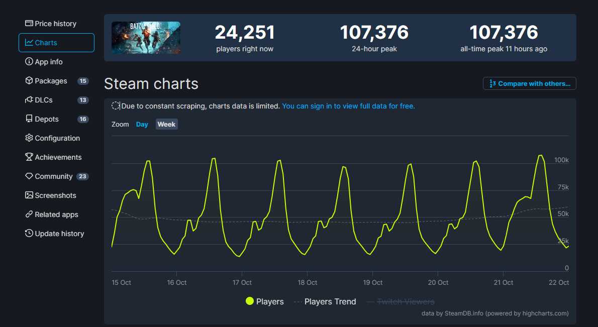 继《赛博朋克2077》后,《战地2042》似乎也要让自己的风评回转了,现在根据SteamDB数据来看,游戏《战地2042》的Steam在线峰值已经打破了记录,来到了10.7万,比首发时的数据还要高。