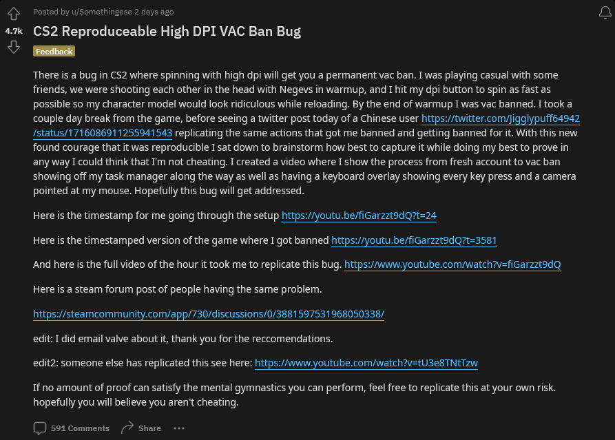 唯一的好消息是,这个 VAC 的 BUG 出发的几率并不高,因为大多数 CS 玩家都是低 DPI 玩家,也没有人会真的用 1 万多的 DPI 玩《CS2》。而那些想要试试自己运气的玩家,还是不要冒险最好,除非你用小号尝试。