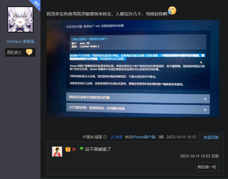 许多玩家也报告了相同的问题,一些被封玩家仅仅是在热身阶段摆动了视角就被封禁。有些玩家第一场比赛就触发了反作弊系统,也有玩家打了一个多小时才被封号。