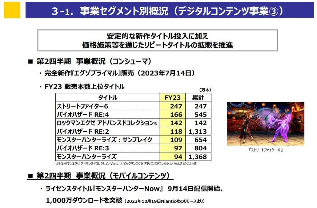 《怪物猎人崛起:曙光》累计销量654万份,《怪物猎人:崛起》累计销量1368万份。《洛克人EXE合集 1+2》累计销量142万份(该数据为1和2的合计销量)。