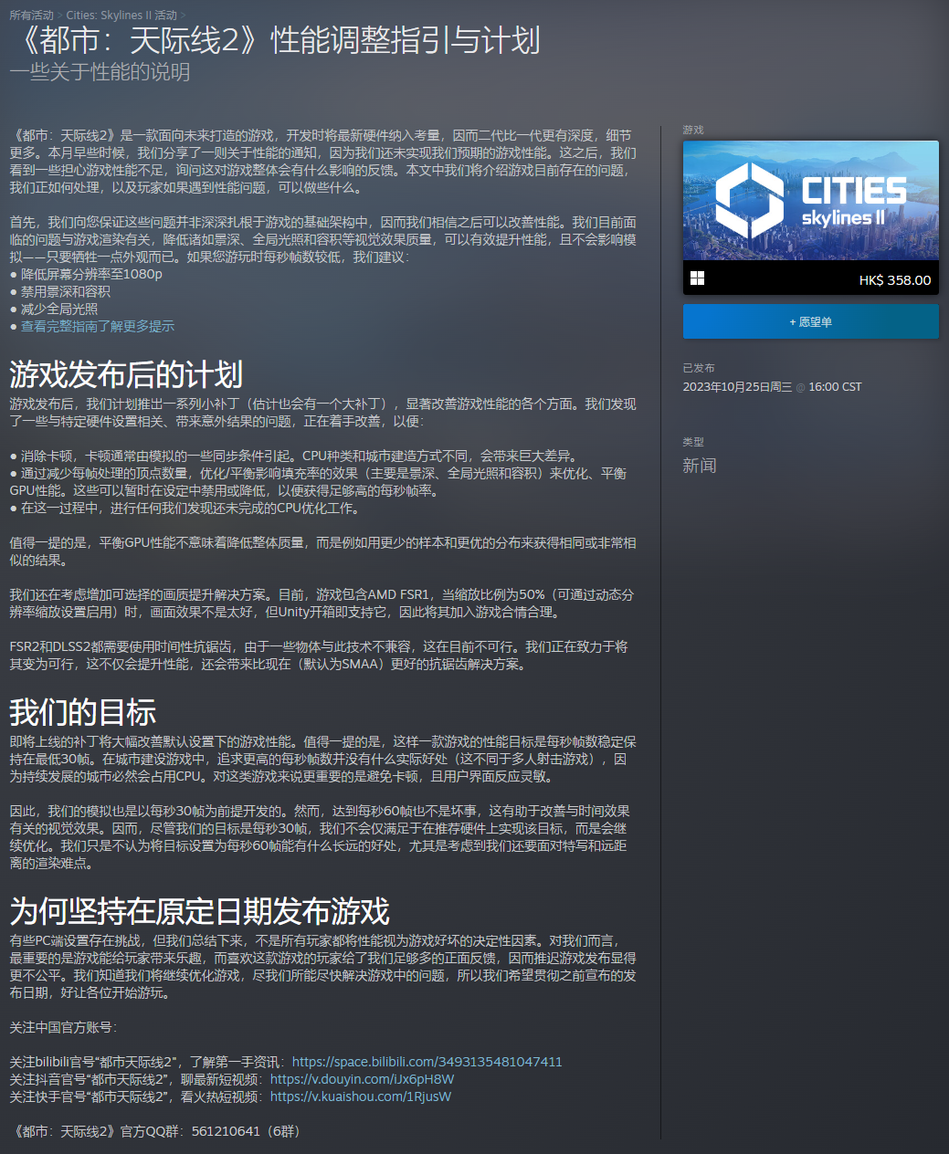 另外,在文中他们还表示计划在之后推出一系列补丁,以显著改善游戏性能的各个方面,而游戏的性能目标则是稳定每秒30帧,非60帧,因为过高的帧率对城市建设游戏没有好处,持续发展的城市必然会占用CPU,对这类游戏来说更重要的是避免卡顿和用户界面反应灵敏。