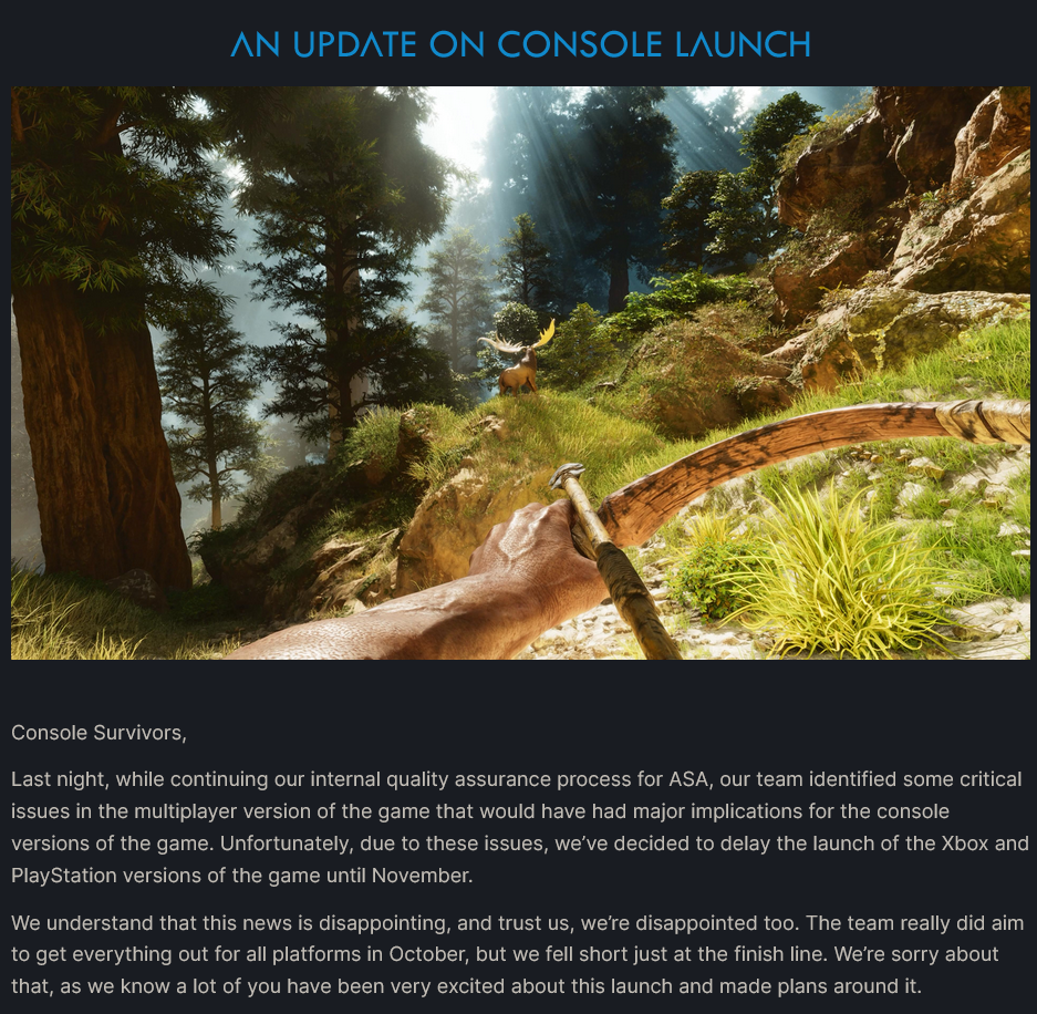 游戏开发商 Studio Wildcard 和发行商 Snail 还宣布,游戏的主机版本将登陆 PS5 和 Xbox Series,并将于 11 月推出。