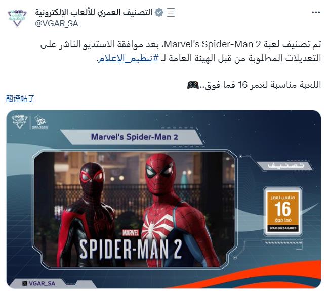 此外,这个消息也获得了沙特阿拉伯电子游戏分级机构的确认,他们在上个月发文表示,开发商接受了监管机构的要求,并修改了游戏,《漫威蜘蛛侠2》在沙特阿拉伯获得了16+的游戏评级。