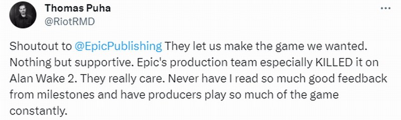 《心灵杀手2》现已正式发售,游戏目前受到媒体和玩家的广泛好评,由于游戏是由Epic出资帮助开发,因此该作是首发Epic独占,近日Remedy公关总监Thomas Puha发推文感谢了Epic,具体的信息感兴趣的玩家可以了解一下。