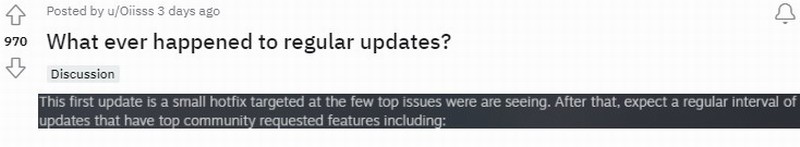 在9月14日的更新中,B社告诉粉丝们会定期更新,其中包含社区要求的顶级功能。但在这之后,仅更新了两次,解决了几个问题。而那些所谓的重要更新却一个也没看到。许多人对此表示很失望。