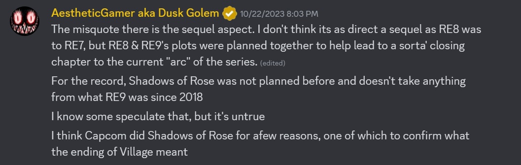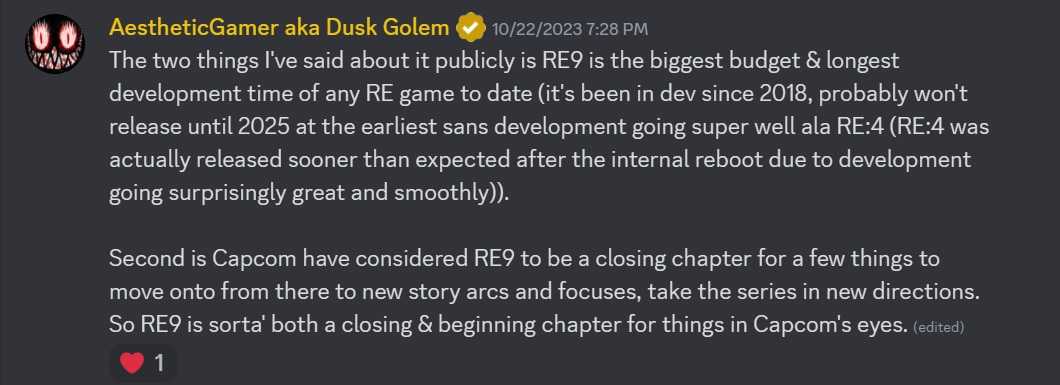 曾经常准确爆料Capcom游戏推主Dusk Golem表示他认为《生化危机9》将不是《生化危机8:村庄》的直接续作,尽管8和9曾一起被规划,目的是将当前的故事线终结。