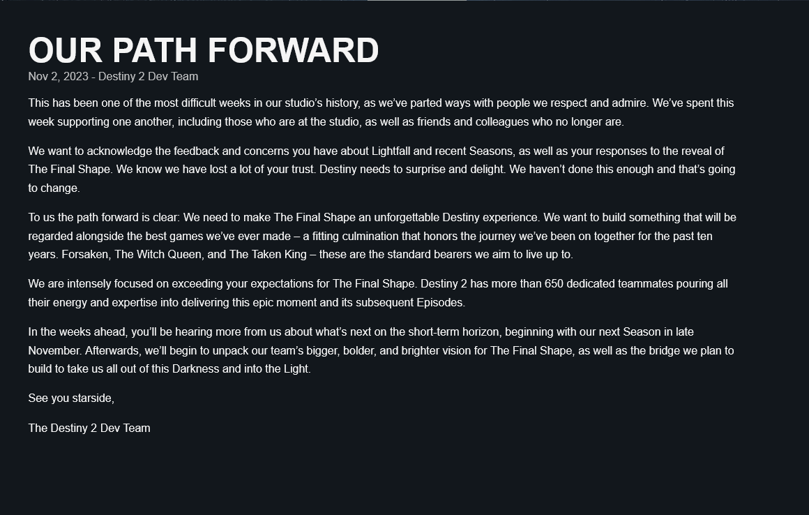 “在接下来的几周里,你会从我们这里听到更多关于短期计划的信息,从 11 月下旬的下一个赛季开始。之后,我们将开始阐述我们团队对于《终焉之形》更大、更大胆、更光明的愿景,以及我们计划建造得让所有人走出黑暗、进入光明的桥梁。”