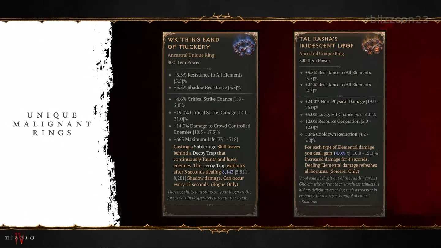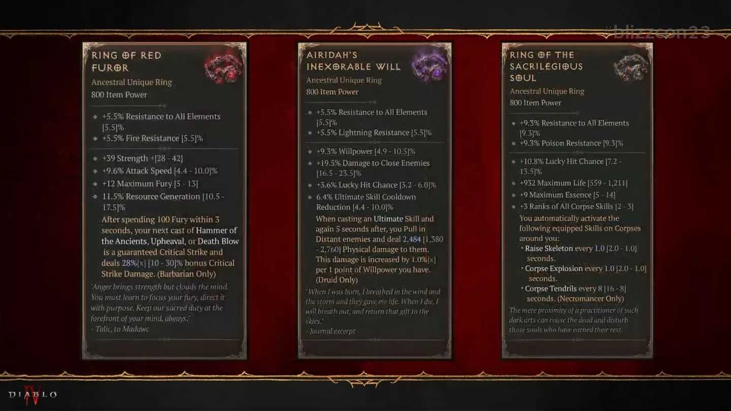 游戏中为每个职业各新增一个戒指,总共有五个全新的独特戒指。这些戒指都是根据恶疫魔赛季受欢迎的恶疫能力所设计,可立即在赛季界域和永恒界域中使用。