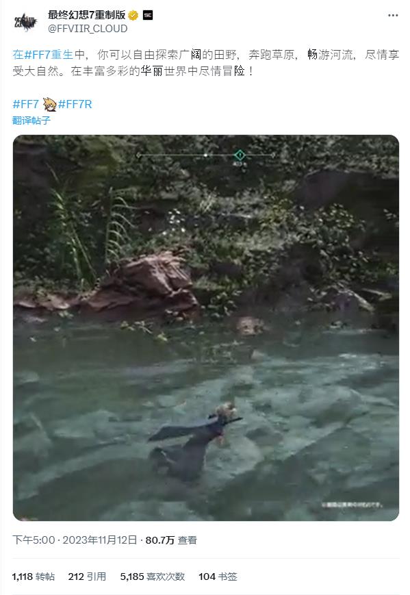 现在玩家可以确信,克劳德真的可以在水中游泳。近日《最终幻想7重置版》的官方,在推特上发布了一则推文,提示玩家可以在“重生”中自由探索广阔的田野,畅游河流,敬请享受大自然。