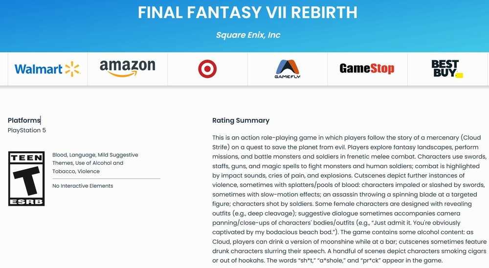 ESRB分级信息描述称,《最终幻想7:重生》战斗中有很多暴力场景,还有血液溅射和角色被剑刺伤或砍伤。刺客向目标投掷旋转刀片,角色被士兵射杀,还有被剑刺穿。一些女性角色的服装设计很暴露(比如深V领),并且伴随着角色身体/服装的镜头切换/特写,会有暗示性对话出现。有角色甚至说:“承认吧,你显然被我健美身材迷住了”。游戏中有饮酒吸烟内容,还有“sh*t、a*shole和pr*ck”等脏话出现。
