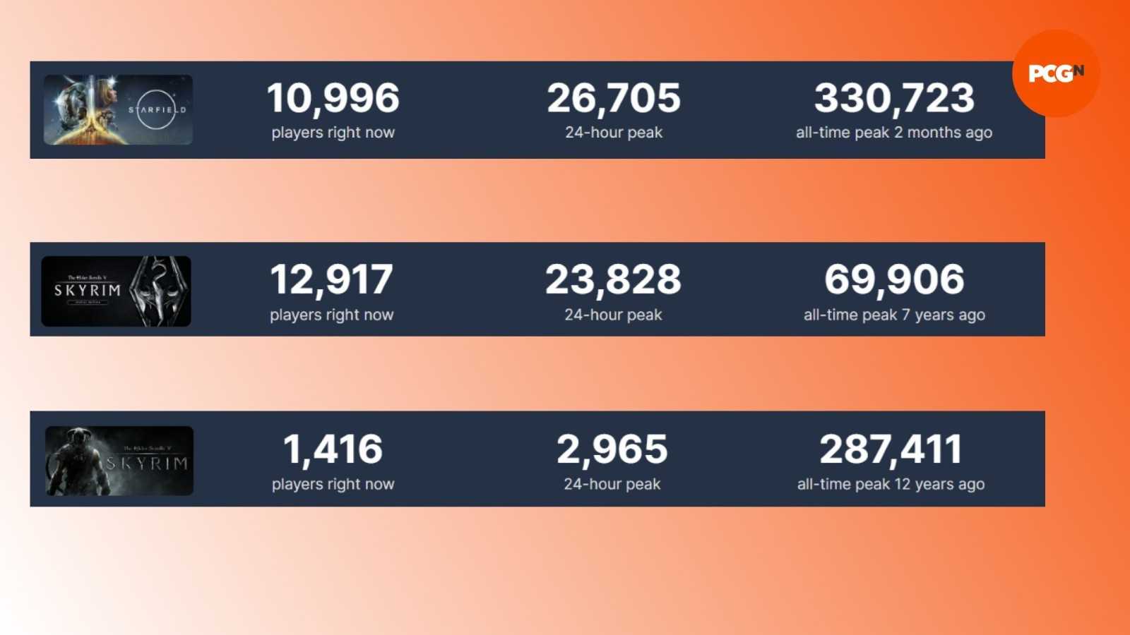 《星空》距离发售已经有2个月的时间,目前游戏的表现并不好,本次2023年TGA游戏提名也并不出彩,根据Steamdb数据显示,目前游戏在Steam平台的玩家数量已经没有《上古卷轴5》多了,而《上古卷轴5》大概率会是B社作品中最受玩家喜爱的游戏。