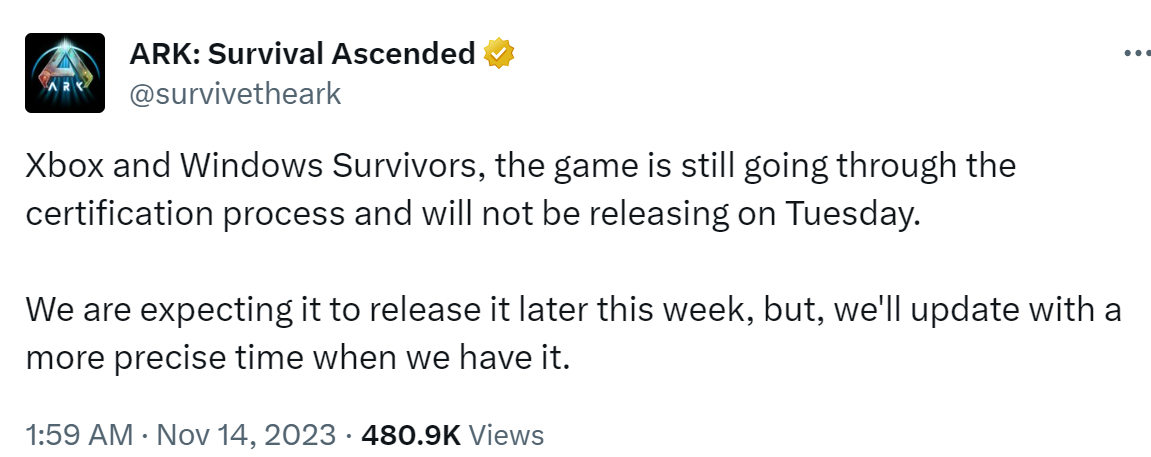 《方舟:生存飞升》原本正计划上线Xbox平台和win商城,但是现在官方宣布游戏游戏仍然在认证环节,因此将会推迟发售,预计会在本周晚些时候完成上架,但是具体时间并不清楚,感兴趣的玩家可以了解一下。