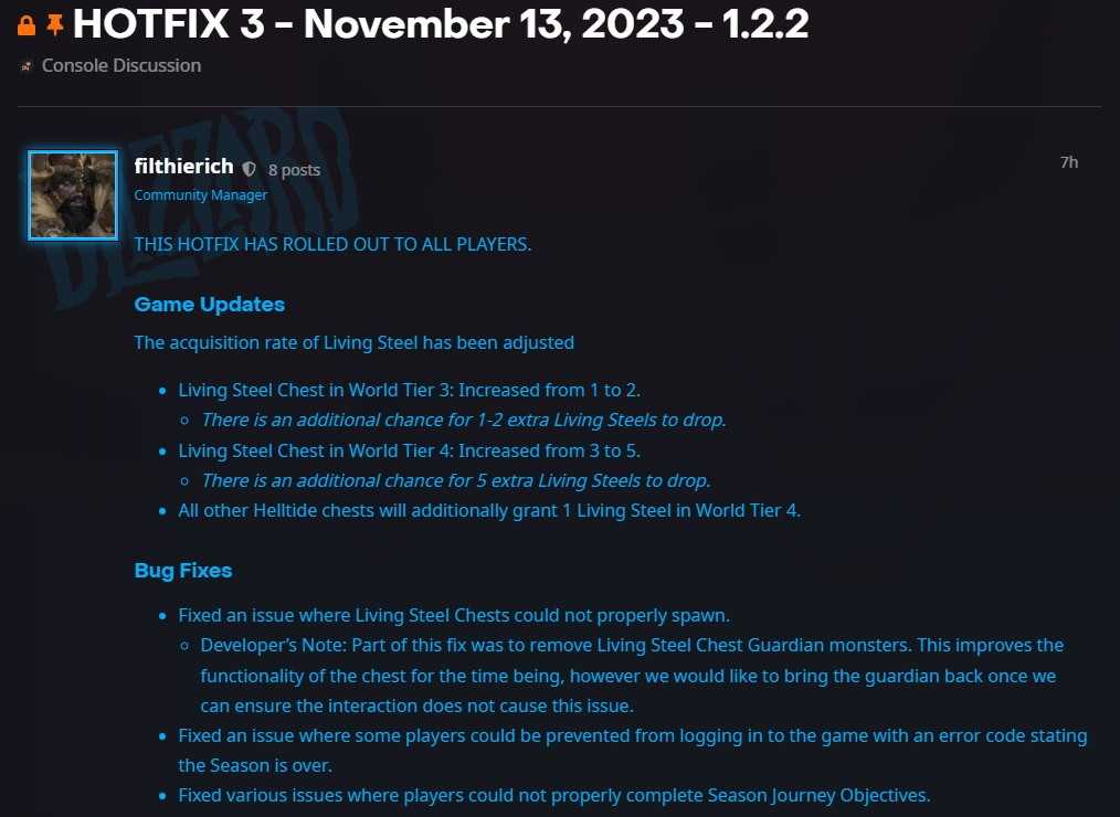 《暗黑破坏神4》近日由暴雪宣布游戏的1.2.2版Hotfix 3补丁已经上线了,本次补丁改善了游戏的体验,玩家可以自由的随时刷取活体钢铁了现在,具体的更新内容感兴趣的玩家可以了解一下。