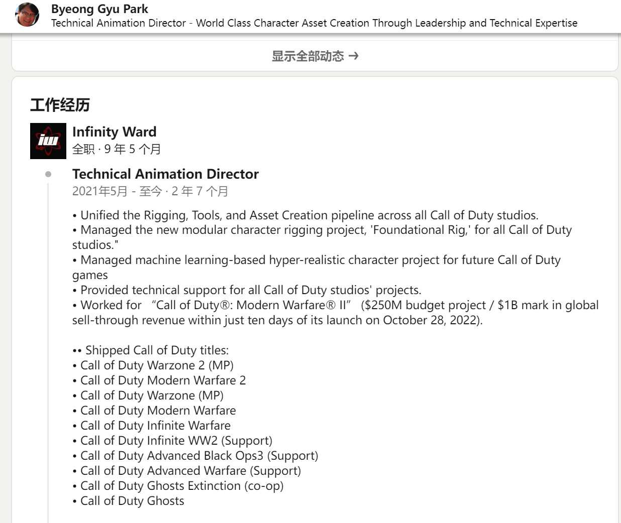 根据玩家发现的IW技术动画总监Byeong Gyu Park的领英简历,《使命召唤19》项目预算高达2.5亿美元,但这款游戏仅用了10天时间,就带来了超过10亿美元的创收。