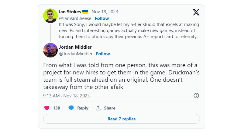 在索尼官宣消息后,一名用户在Twitter上表示索尼应该让顽皮狗开发新游戏,而不是强迫他们重制复刻游戏。对此,外媒VGC的记者Jordan Middler回复说:“据我所知,这更像是一个让新人练手的项目。”随后他透露尼尔和其团队正忙着开发一个新作。
