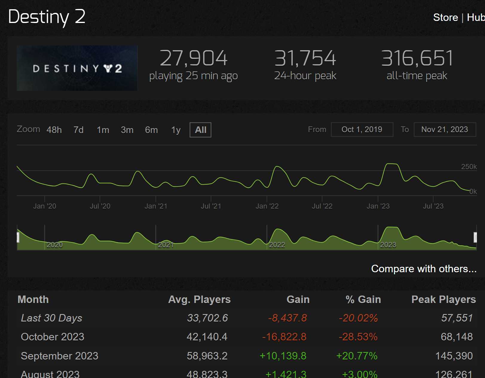 虽然对于一个已经在市场上推出7年的游戏来说(命运2最初于2017年9月发售),玩家数量的下滑并不是那么出人意外,但Bungie的这款射击游戏在其资料片“光陨”于今年2月推出时,实际上其在线玩家峰值却来到了最高,达到了31万6651人。