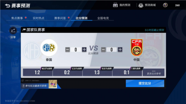 为了更好助威国足世预赛,提升经理们的赛事参与感,11月16日游戏更新后,《绿茵信仰》预测系统新增【比分预测】功能!经理们只要能够正确预测本场「泰国vs中国」比分,将能获得「招募券*100」好礼!本场比分预测将于11月16日更新后开启,20:30前截止。想要进行预测获得好礼的经理,参与时间莫要忘记!
