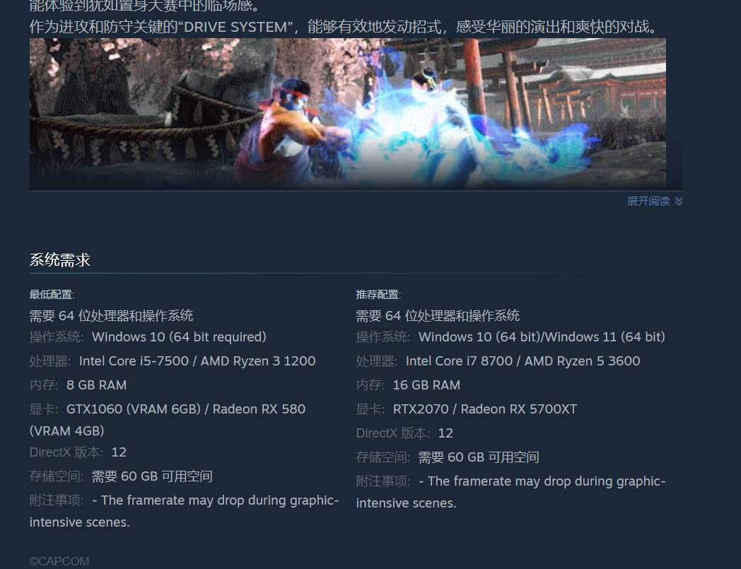 以下是Capcom格斗游戏《街头霸王6》的PC配置情况,推荐配置方面,《街头霸王6》和《铁拳8》对显卡的要求竟然一样,都是RTX 2070或AMD Radeon RX 5700XT。CUP方面,《街霸6》要求稍微高一点。但硬盘空间方面,《铁拳8》就大得多,达到了100GB,而《街霸6》只是60GB。