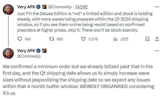 Swen Vincke表示《博德之门3》豪华实体版不是限量版,库存将保持稳定,在2024年第一季度的出货期将提供多次购买机会,如果玩家在网上看到了高价转售的情况,请不要理睬,《博德之门3》豪华实体版不会出现库存短缺的情况。