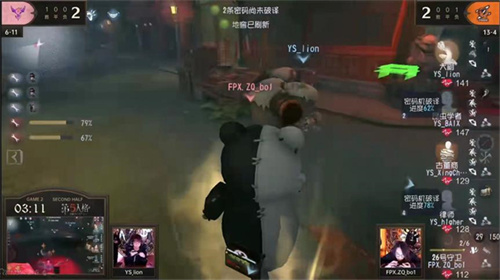 第三天FPX.ZQ vs YS第二局下半局,FPX.ZQ_bo1邦邦果断闪现机人同守,逐个击破拿下四抓:前期古董商利用机关箫拉点,邦邦精准二连雷将其击倒,此时场上密码机总量约两台半。守椅时YS_lion大副博弈更胜一筹,不吃刀救人并且给古董商一定的二次牵制空间,邦邦利用古董商贪图牵制的心理逼光其机关箫并将其击倒,牵至昆虫学者遗产机。在逼远昆虫学者后,邦邦外围连炸命中大副,利用受伤不能交怀表的僵直闪现将其击倒,守椅拦截成功的同时续上二手节奏并牢牢压住最后一台密码机。随后,邦邦拉扯消磨求生者的状态,利用遥控雷封住密码机,逐步消耗拖出传送,逼迫昆虫学者强修密码机并将其击倒,淘汰昆虫学者后将大副和律师逐个击破拿下四抓,帮助FPX.ZQ逆转了比分上的劣势。