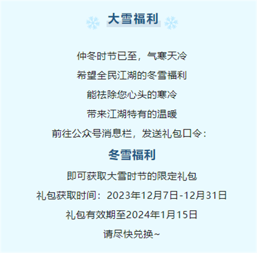 >礼包获取方式:【全民江湖丸子官方版】【全民江湖贪玩版】公众号消息对话框输入礼包口令:冬雪福利