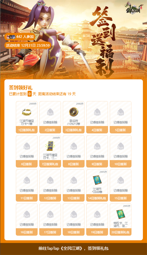 >礼包获取方式:前往TapTap软件搜索《全民江湖》,找到置顶签到活动帖子,点击立即签到,达成相应签到天数即可领取礼包。