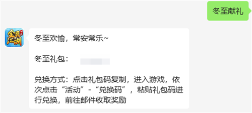 冬临春生,期许已至,长夜漫漫,《全民江湖》人情暖。冬至献礼限时礼包已上线,祝愿各位大侠在寒冷的冬日能感受到江湖的温暖。前往公众号【全民江湖丸子官方版】或【全民江湖贪玩版】对话框,输入:冬至献礼,即可领取您的暖心礼包!礼包有效期至12月31日,请尽快兑换~